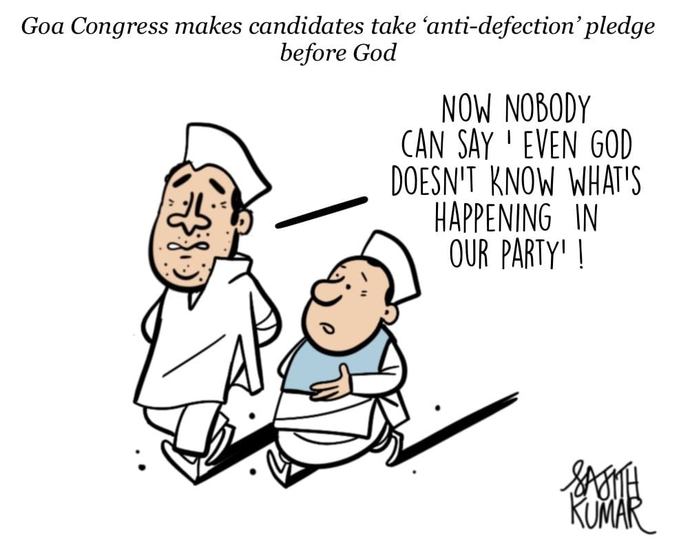 Sajith Kumar pokes fun at the Congress in Goa, which had its candidates make a pledge of loyalty before God that they would not defect to other parties if elected in the upcoming state assembly polls.