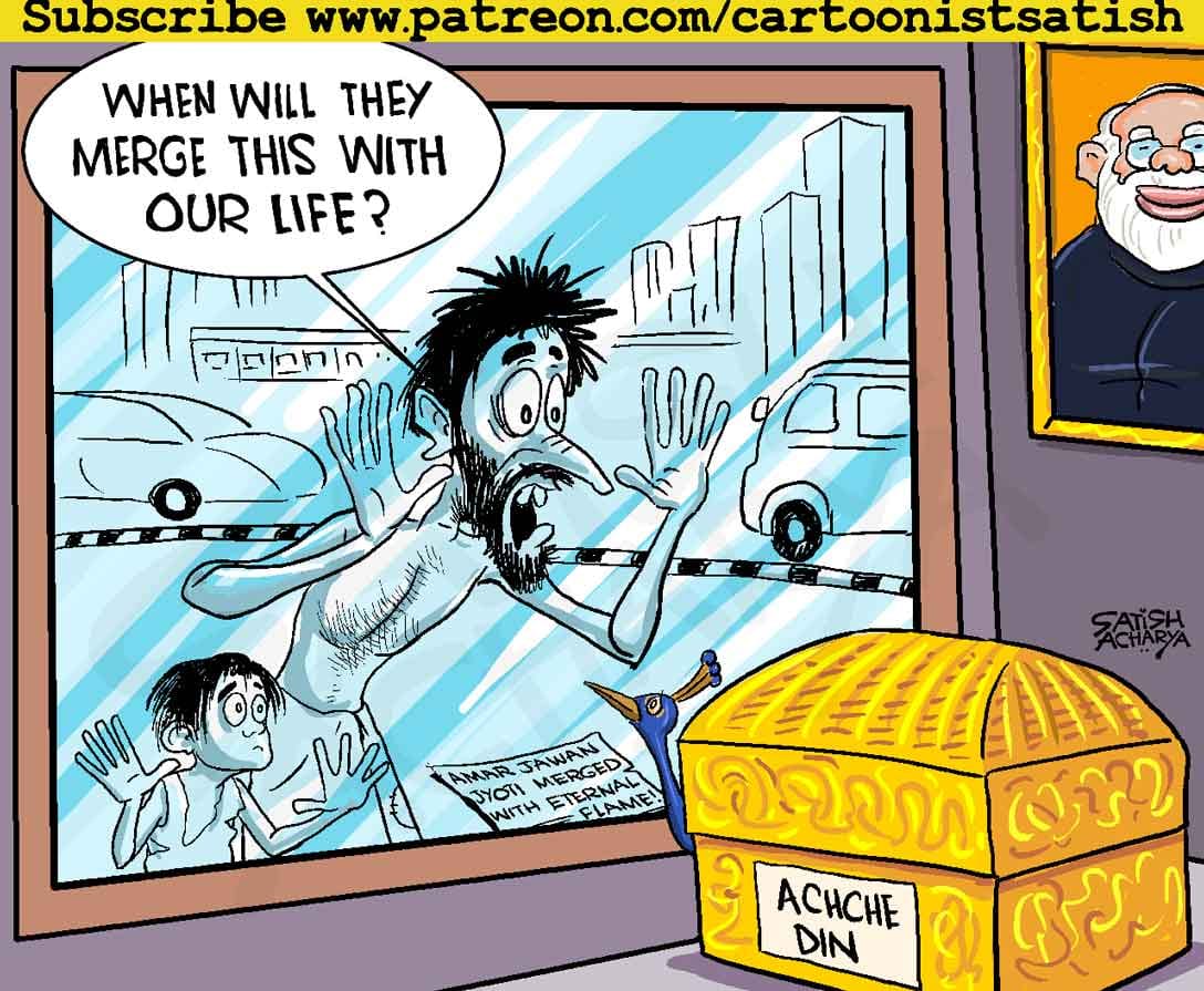 Satish Acharya alludes to PM Modi’s promises of prosperity in the light of another symbolic move, in which the iconic Amar Jawan Jyoti flame at India Gate — established in 1972 to commemorate soldiers killed during the India-Pakistan war the previous year — was taken and merged with the eternal flame at the National War Memorial, 400 metres away.