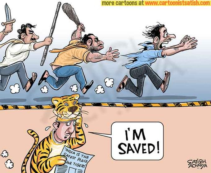 Satish Acharya takes a jibe at the recurring incidents of mob-lynching in different parts of the country. While PM Modi claimed India to be a safe abode for tigers on International Tiger Day, the scenario isn’t the same for humans.