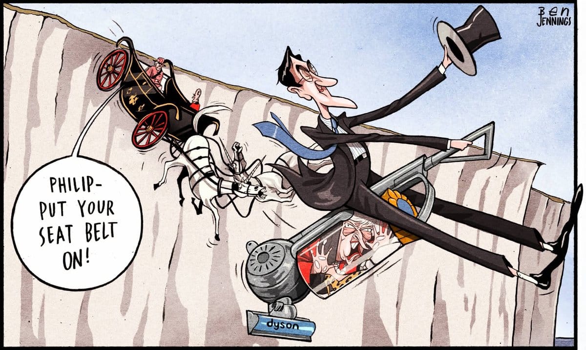 Ben Jennings, in The Weekend, takes digs at James Dyson, the British billionaire and Brexit backer, who recently moved the headquarters of vacuum cleaner company from Britain to Singapore and at British Prince Philip,on his part in the car crash that has sparked a controversy.