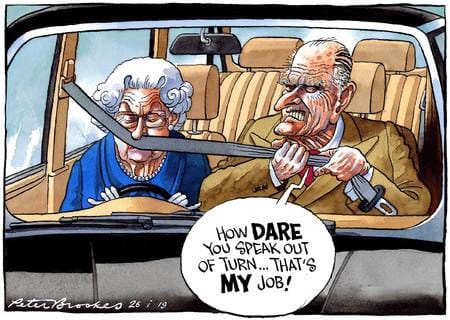 Peter Brooks for The Times also takes a jibe at the car crash involving Prince Philip. The 97-year-old had sparked controversy after he was photographed, less than 48 hours after the crash, driving without a seat-belt.