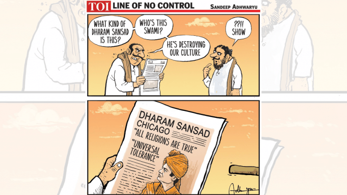 In today’s featured cartoon, Sandeep Adhwaryu reflects on how Swami Vivekananda, who in 1893 spoke about universal tolerance at the Parliament of the World’s Religions in Chicago, would be received today in a time of alleged hate speeches at ‘Dharam Sansads‘ (literal translation, religious parliament). Vivekananda’s birth anniversary was on 12 January.