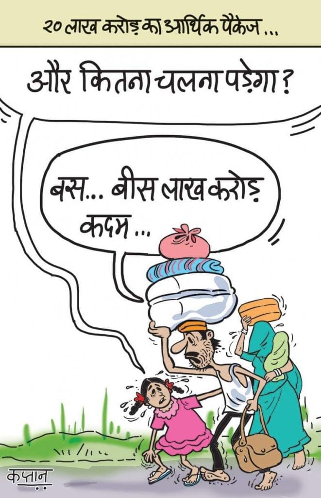 In today’s featured cartoon, Alok Nirantar takes a jibe at the new endorsement of being ‘Atma Nirbhar’ by the government by contrasting it with the viral photograph of a young boy sleeping on a suitcase.