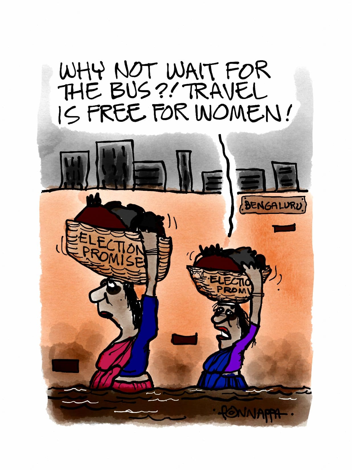 Nala Ponnappa gives his satirical take on Karnataka Chief Minister Siddaramaiah’s declaration of providing free bus passes to women when traveling on “government buses”.