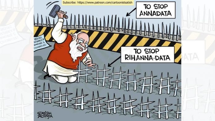 In today’s featured cartoon, Satish Acharya comments on the Modi government’s response to the international support Indian farmers have been receiving in the past two days, especially after US popstar Rihanna tweeted about the issue.