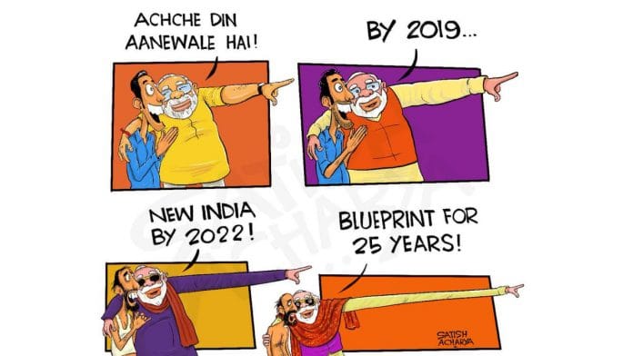 In today’s featured cartoon, Satish Acharya comments on the promises made by Prime Minister Narendra Modi since before his election in 2014, and says they seem to be getting pushed further and further into the future, after Finance Minister Nirmala Sitharaman spoke about the ‘blueprint’ for the next 25 years in her Budget speech.