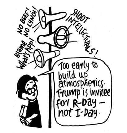 E.P. Unny, in The Indian Express, has a witty take on the Narendra Modi government’s Republic Day invite to Donald Trump. The cartoon suggests that the atmosphere of hate, fake news and chaos is perfect for a Trump visit.
