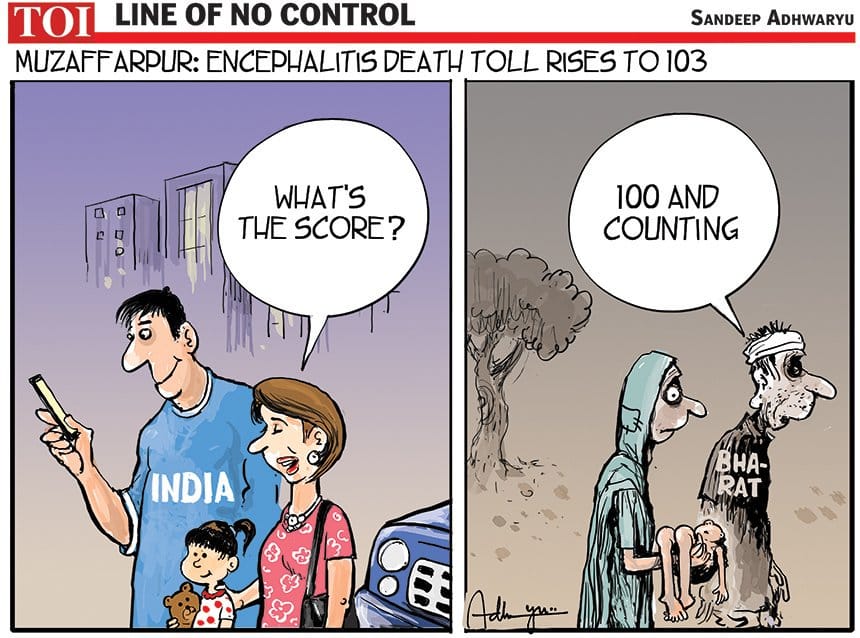 While India celebrates its high scores and sweeping performance in the ICC World Cup tournament against Pakistan, Sandeep Adhwaryu depicts the rising death toll of children due to encephalitis in Muzaffarpur, Bihar.