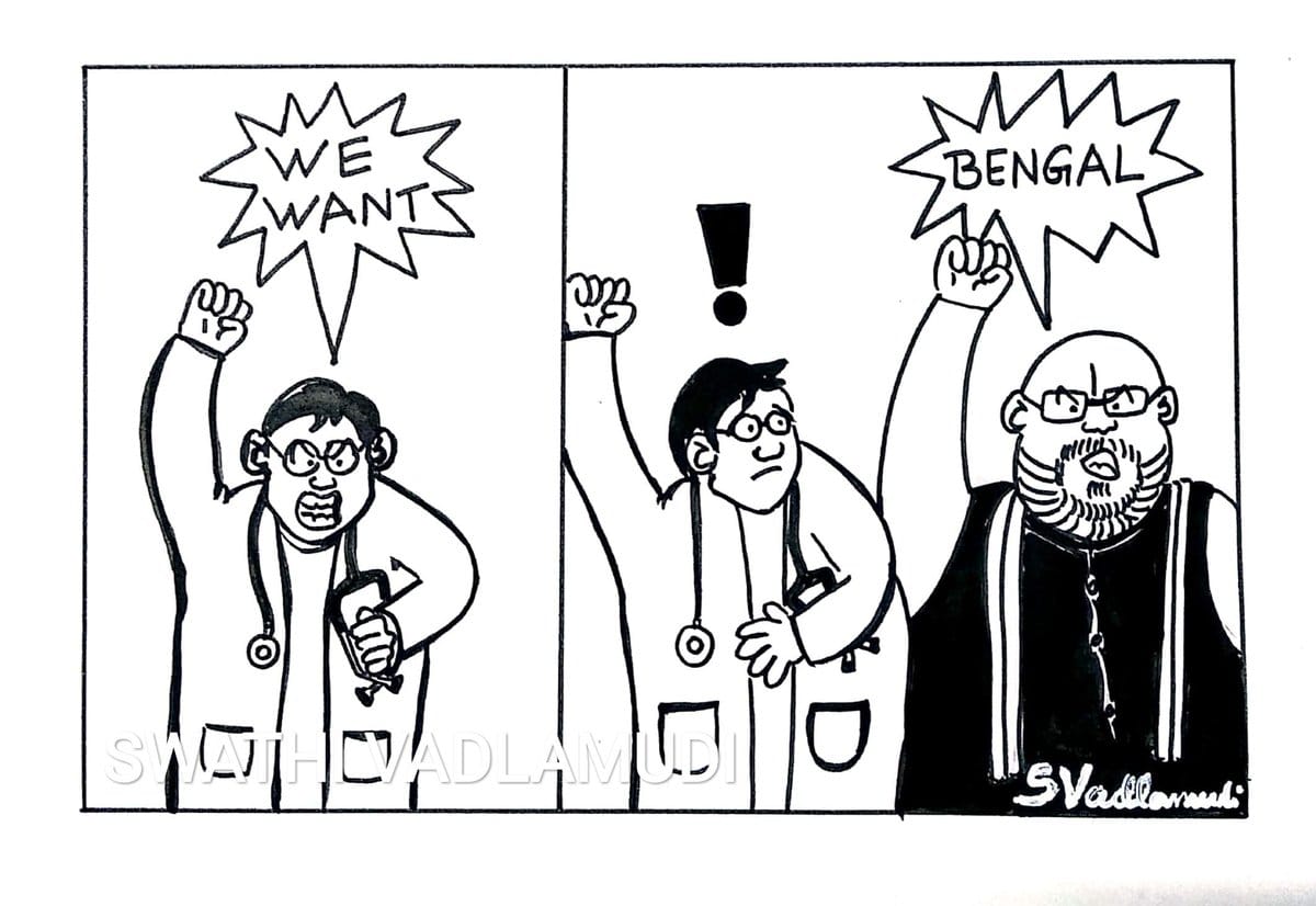 In today’s featured cartoon, Swathi Vadlamoodi depicts Home Minister and BJP chief Amit Shah eyeing to conquer West Bengal after doctors and medical students across the state protested against Mamata Banerjee’s TMC government following a mob attack on junior physicians at NRS Medical College and Hospital over the death of a patient.