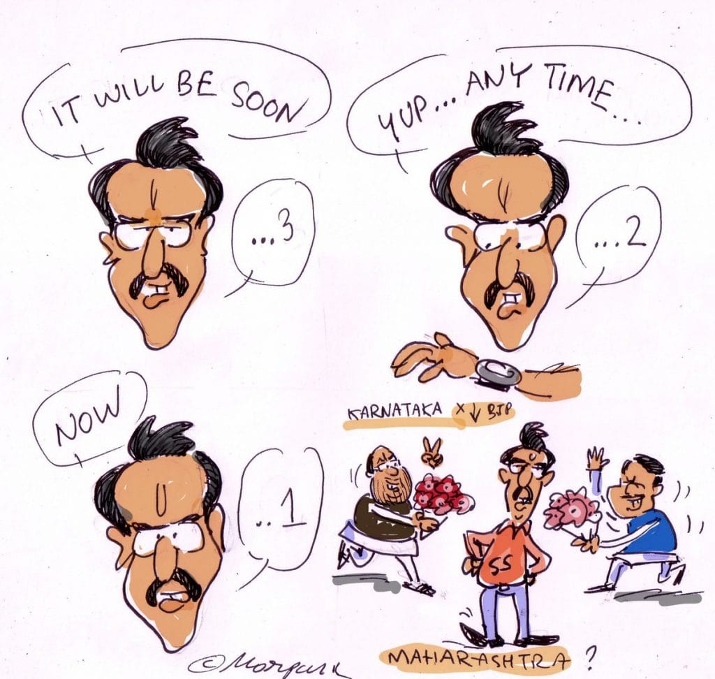 Many cartoonists sought to mock BJP chief Amit Shah’s meeting with Shiv Sena chief Uddhav Thackeray despite the latter announcing its decision to part ways. In Mail Today, Satish Acharya does a retake on a cartoon by the legendary R.K. Laxman in 1990, depicting the late BJP leader Pramod Mahajan, the architect of the alliance, and the late Shiv Sena founder Bal Thackeray.