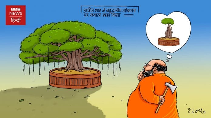 In today’s featured cartoon, Gopal Shunya comments on Home Minister Amit Shah raising questions on whether multi-party democracy has succeeded in the country.