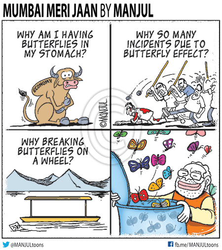 Manjul touches upon several issues in his cartoon — mob lynching, economic slowdown, abrogation of Article 370 — and juxtaposes them with Modi releasing a bag full of butterflies to mark his birthday on 17 September.