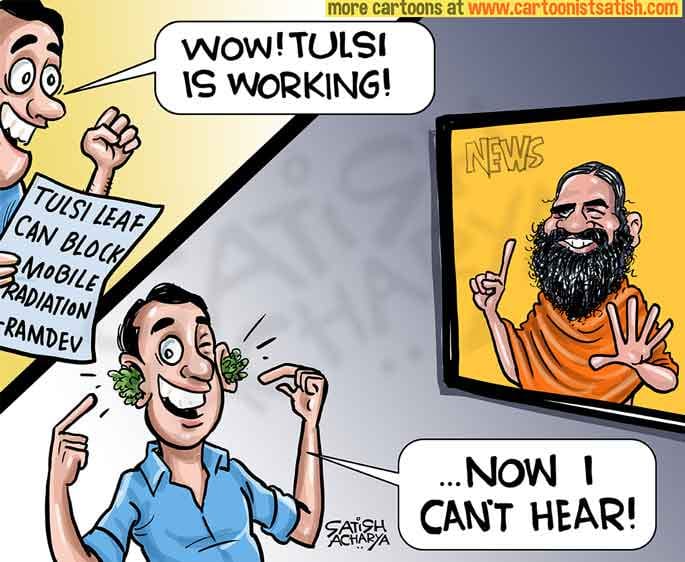 Satish Acharya takes a jibe at yoga guru Baba Ramdev for claiming that tulsi leaves block mobile phone’s radiations.