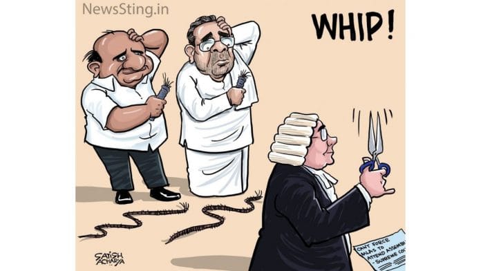 In today’s featured cartoon, Satish Acharya weighs in on the Supreme Court’s verdict on the Karnataka drama. The top court Wednesday directed that 15 rebel Congress-JD(S) MLAs — who have been issued a whip to attend the Assembly — cannot be compelled to take part in the House proceedings.