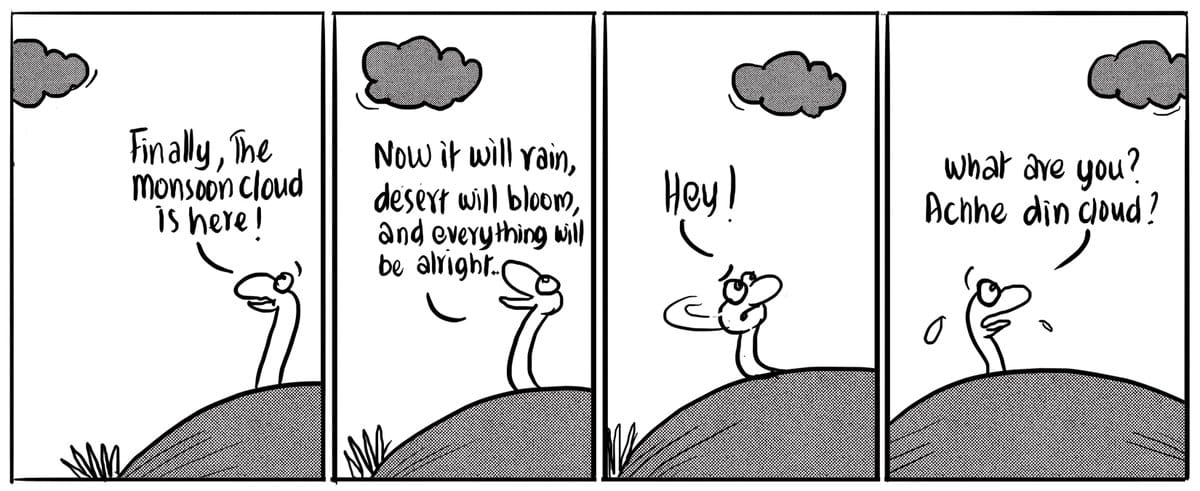 In The New Indian Express, Gokul Gopalakrishnan draws a parallel between an elusive monsoon and the BJP government’s promise of achhe din, which critics say never came.
