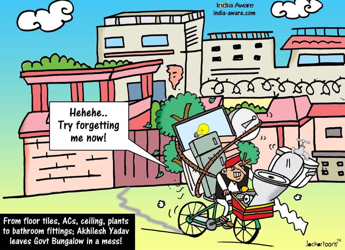 Cartoonist Sanket Jack mocks the damage reportedly caused by former Uttar Pradesh chief minister Akhilesh Yadav to his former official bungalow, which he recently vacated.