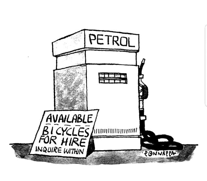 As fuel prices continue to shoot up, Nala Ponnappa depicts a petrol pump exploring an alternative business — giving bicycles for hire.