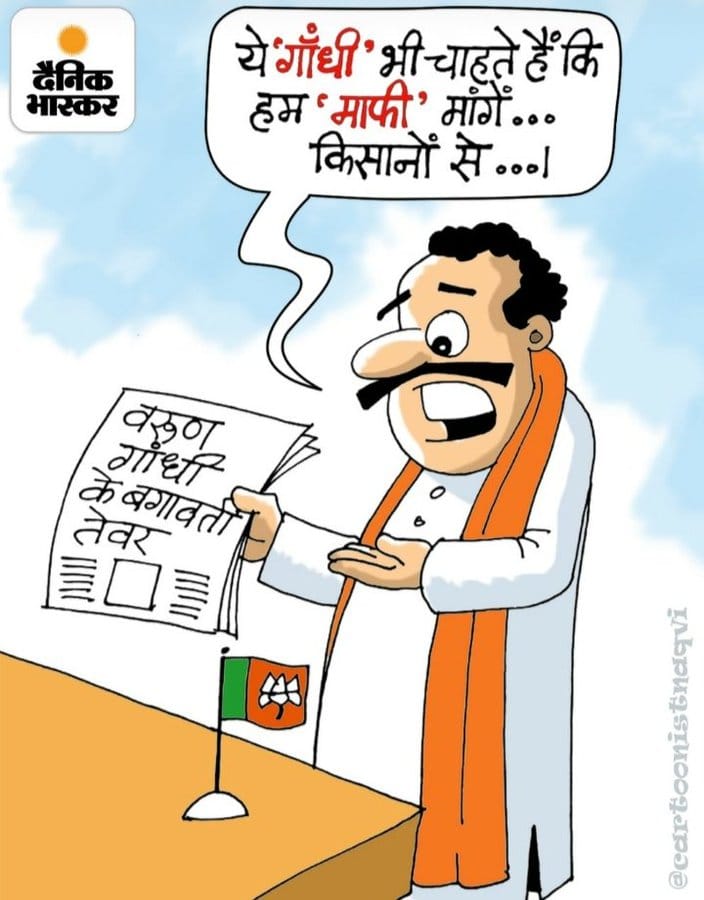 Mansoor Naqvi weaves together two pieces of news — Defence Minister Rajnath Singh saying Mahatma Gandhi had advised Veer Savarkar to write a mercy petition to the British, and BJP MP Varun Gandhi’s ‘rebellion’ against his party on farmers’ issues and the Lakhimpur Kheri incident — to show a BJP worker exclaiming that another ‘Gandhi’ is advising the party to apologise.