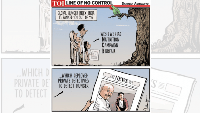 In today’s featured cartoon, Sandeep Adhwaryu refers to India slipping down the Global Hunger Index, which was launched Thursday, and wonders if the fix would be to have a Nutrition Campaign Bureau with ‘private investigators‘, like the Narcotics Control Bureau is alleged to have deployed in the Aryan Khan drug bust case.