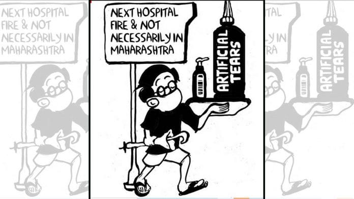 In today’s featured cartoon, E.P. Unny takes a swipe at the reactions to the death of 10 newborn babies in Maharashtra after a fire broke out at a hospital Saturday.