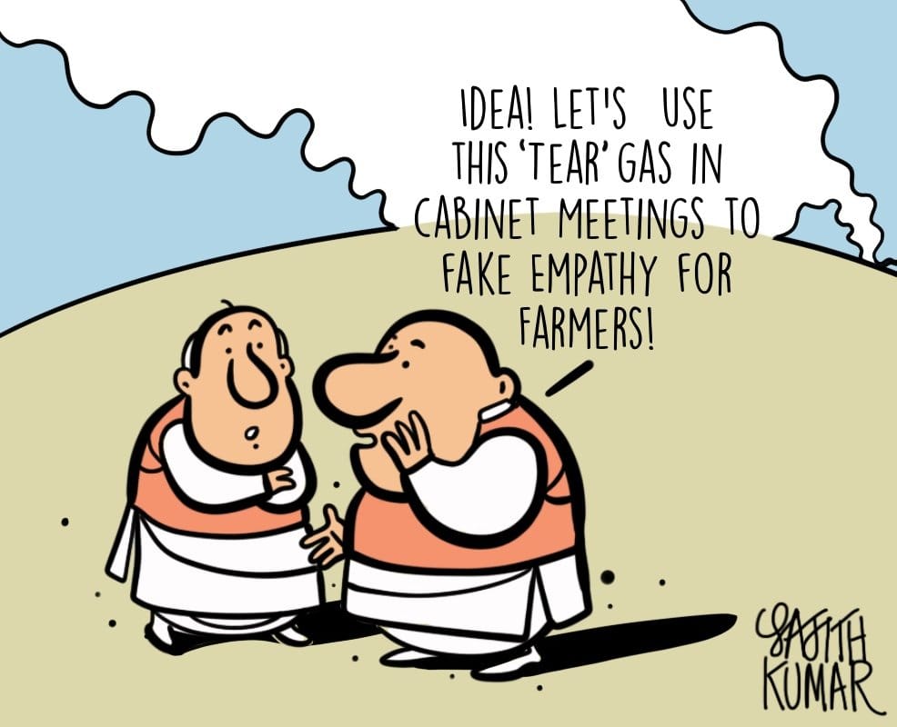 Sajith Kumar takes a dig at the use of tear gas against protesting farmers who disrupted an event that was to be attended by Haryana Chief Minister Manohar Lal Khattar in a village near Karnal Sunday.