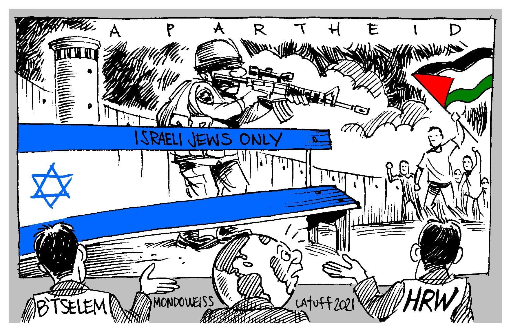 Brazilian cartoonist Carlos Latuff illustrates B’Tselem’s and Human Rights Watch’s documentation of Israeli “apartheid and persecution” of Palestinians.