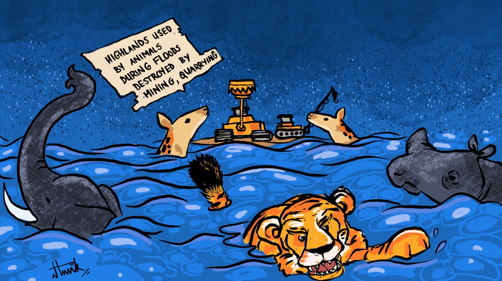 Satwik Gade illustrates the devastating floods in Assam which has submerged over 90 per cent of Kaziranga National Park and killed 15 animals, including a one-horned rhinoceros. More animals are fleeing to higher elevations for safety.