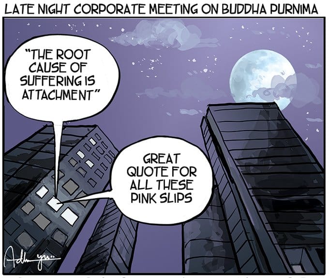 Buddha’s philosophy meets corporate culture in this cartoon by Sandeep Adhwaryu.