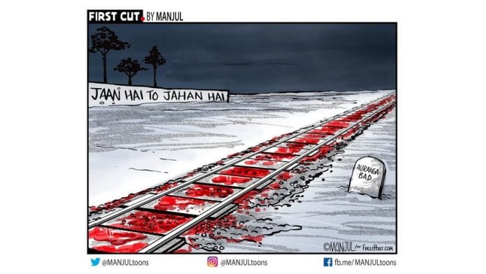 In today’s featured cartoon, Manjul illustrates the deaths of at least 16 migrant workers in the Aurangabad train accident.
