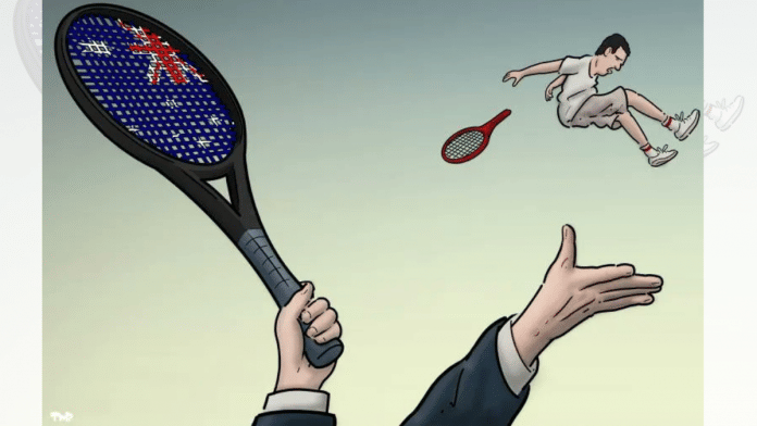 In this week’s featured cartoon, Tjeerd Royaards illustrates an Australian tennis racquet with Novak Djokovic as the ball and sends him to the other side. The allusion is to the Tennis star’s deportation from the country, ahead of the Australian Open.