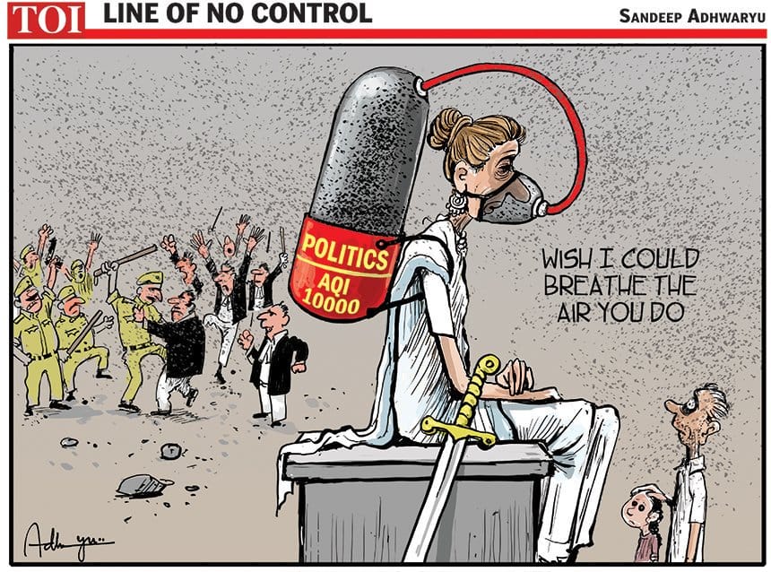 Sandeep Adhwaryu takes a jibe at New Delhi’s air pollution and the law and order crisis.