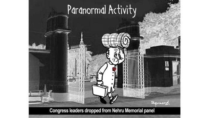 In today’s featured cartoon, R. Prasad takes a potshot at the fact that all Congress leaders were removed from the Nehru Memorial Museum and Library society.