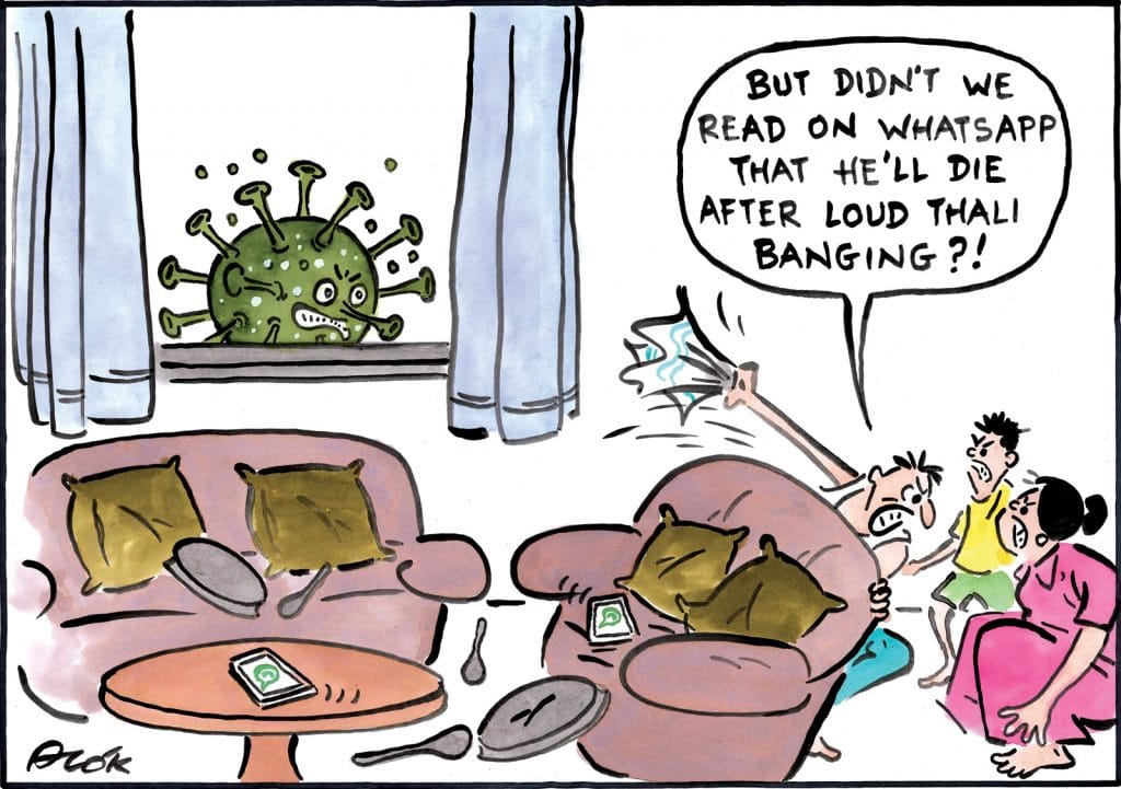 In today’s featured cartoon, Nala Ponappa’s strong commentary on the nation-wide five minute long ‘utensil banging’ observed during the janata curfew Sunday.