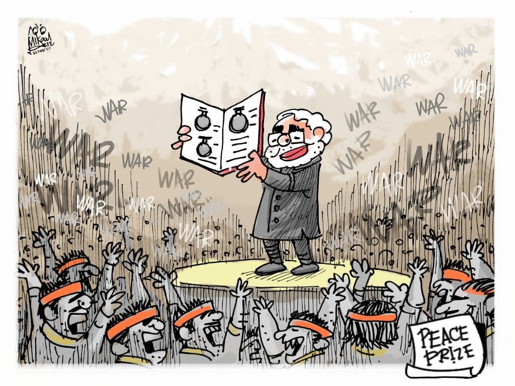 While Prime Minister Narendra Modi lifts the Seoul Peace Prize, Mika Aziz illustrates the PM surrounded by ‘nationalists’ baying for blood and war on Pakistan.