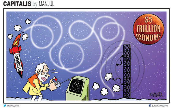 Manjul draws a parallel between the failed soft-landing of ISRO’s Chandrayaan-2 and the current economic situation under the Narendra Modi government.