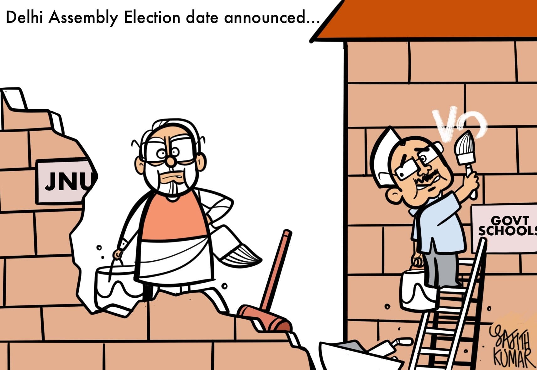 With Delhi assembly elections round the corner, Sajith Kumar alleges that on the one hand, Modi’s BJP is ‘breaking’ institutions like JNU, and, on the other, Arvind Kejriwal’s AAP is focusing on building and developing them.