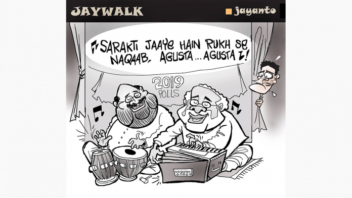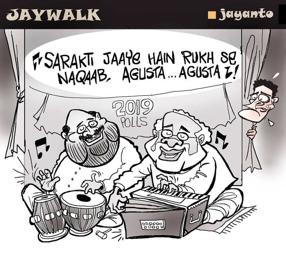 Jayanto suggests that PM Modi must be singing the famous ghazal originally rendered by Jagjit Singh and penned by Ameer Minai, following Christian Michael’s extradition in the AgustaWestland scam. Amit Shah is accompanying the PM on tabla, while Rahul Gandhi looks wary behind the curtain.