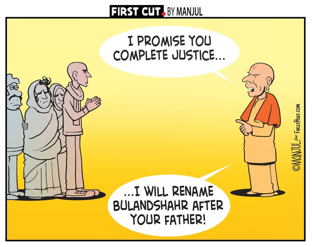 In Firstpost, Manjul makes a dark comment on Uttar Pradesh chief minister Yogi Adityanath’s propensity to rename things as a form of ‘justice’. He promises slain policeman Subodh Kumar Singh’s son that he will rename Bulandshahr after the cop.