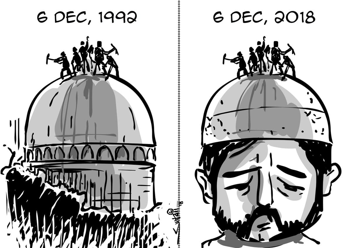 In Greater Kashmir, Suhail Naqshbandi observes the 26th anniversary of the demolition of the Babri Masjid in Ayodhya by depicting a Muslim under attack in the present day.