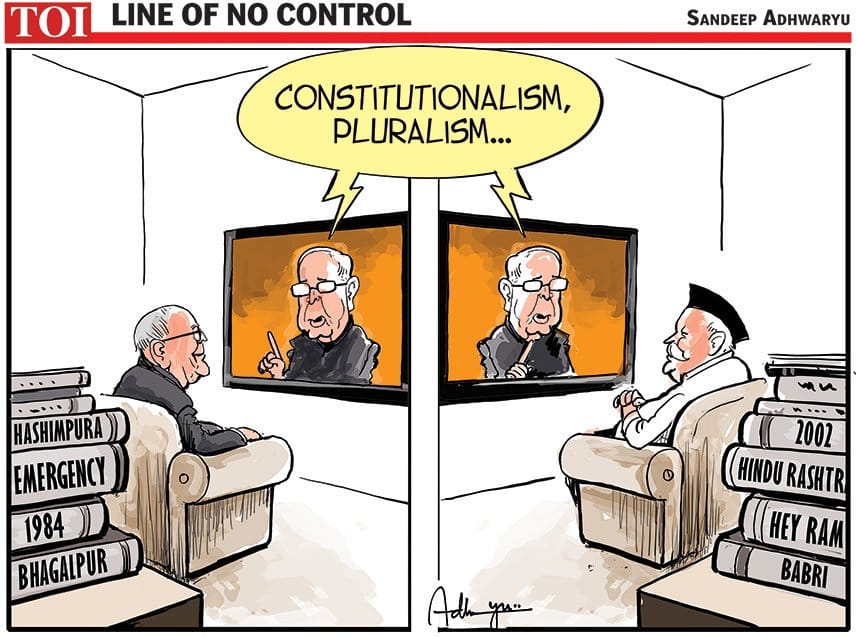 Sandeep Adhwaryu in The Times of India mocks Pranab Mukherjee’s speech about tolerance and constitutionalism to the RSS. He refers to some dark events against the same principles from the history of both RSS and Congress.