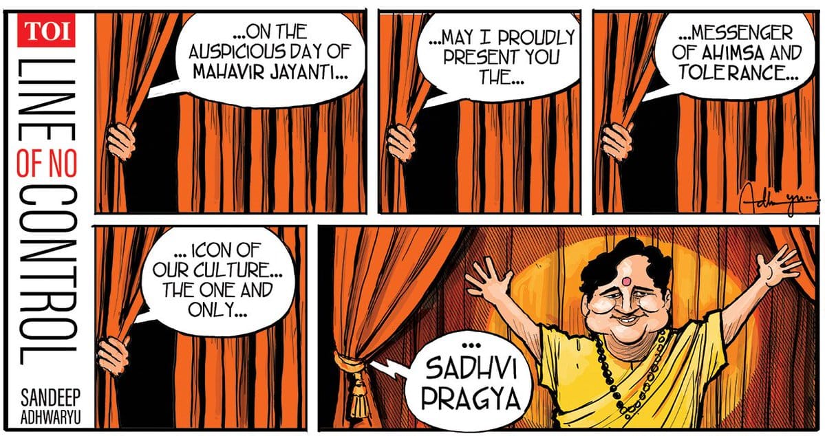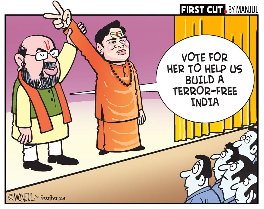 Manjul highlights BJP’s ‘quest’ to build a ‘terror-free’ India as he illustrates party president Amit Shah naming Malegaon blasts accused Sadhvi Pragya Thakur as a candidate from Bhopal for the Lok Sabha elections.