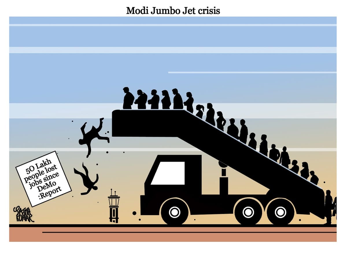 Taking off from a recent report by the Azim Premji University which said that 50 lakh people lost their jobs after demonetisation in 2016, Sajith Kumar takes a dig at crisis-struck Jet Airways. The airline suspended its operations late Wednesday.