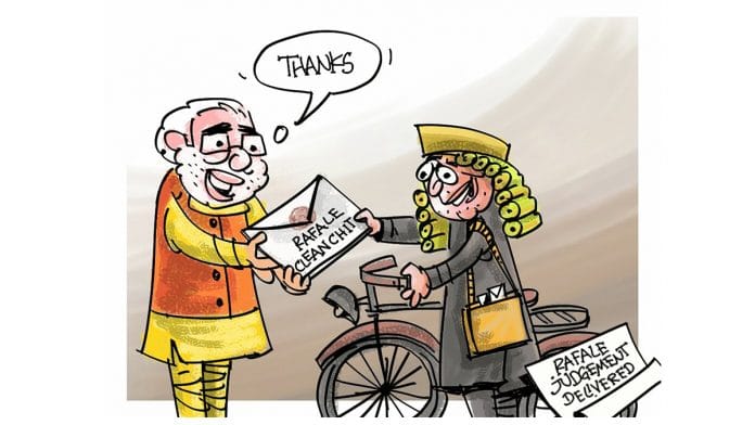 In today’s featured cartoon, Mika Aziz comments on the Supreme Court’s dismissal of the review petitions that sought a probe into the controversial purchase of 36 Rafale fighter jets from French company Dassault Aviation.
