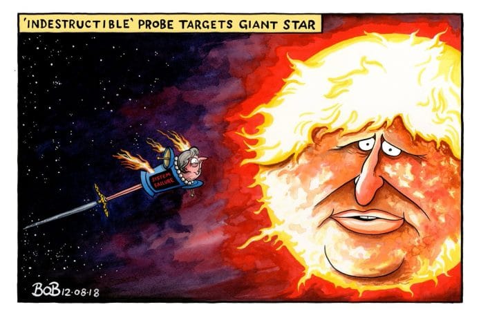 In The Telegraph, Bob Moran highlights the backlash UK Prime Minister Theresa May is facing from within her party for mulling disciplinary proceedings against Boris Johnson for his burqa comment.