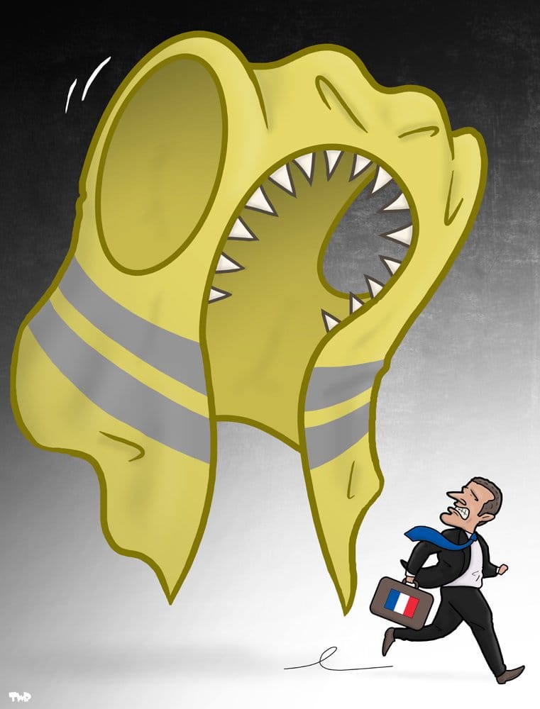 Tjeerd Royaards | NCRProtests against rising fuel prices and planned taxes since 17 November have turned into an uprising against President Macron. Pictured here is a yellow vest, representing the protesters, which has grown teeth and threatens Macron, who tries to run away.
