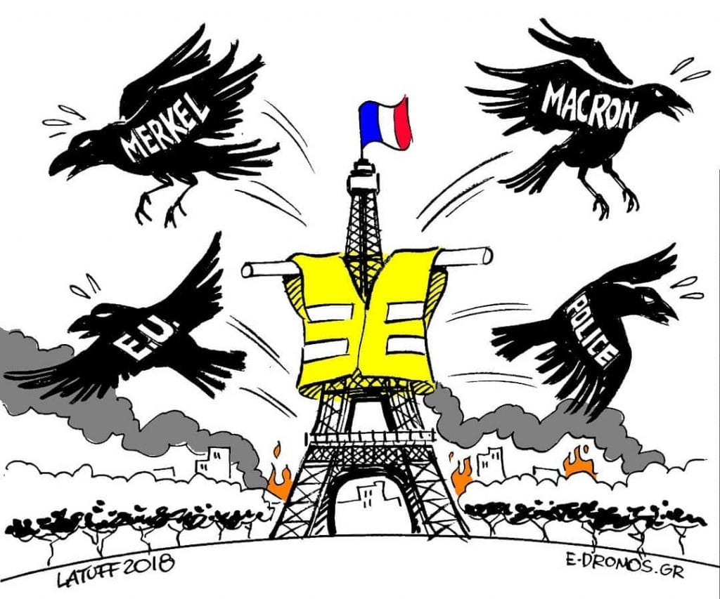 As Paris, which Carlos Latuff symbolises as the Eiffel tower, burns amid riots over planned hikes in fuel taxes, all governing forces (including President Emmanuel Macron) flee.