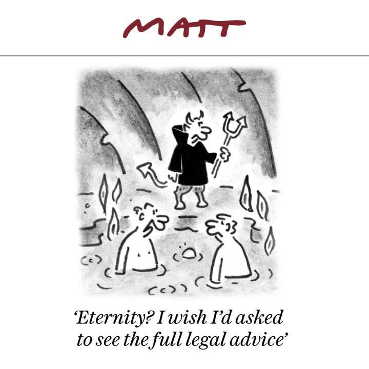 The effects of Brexit, represented by Matt as the pits of hell, are beginning to sink in. A member of the public wishes he had had some foresight before voting for it. The reference is to the recently-published legal advice, which says the UK could be stuck in negotiations over Northern Ireland “indefinitely”.