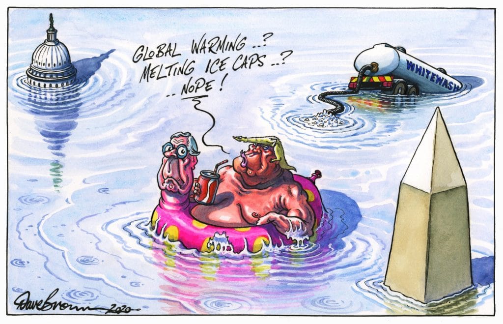 Dave Brown takes a jibe at United States Senator Mitch McConnell, who played an instrumental role in helping Donald Trump float through the impeachment trial. Brown also links it to Trump’s well-known denial of climate change.