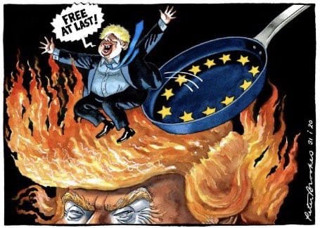 Peter Brookes jokes about a potential post-Brexit UK-US trade deal by showing British PM Boris Johnson celebrating ‘freedom’ by jumping out of the EU frying pan and into the proverbial fire that is Donald Trump’s head.
