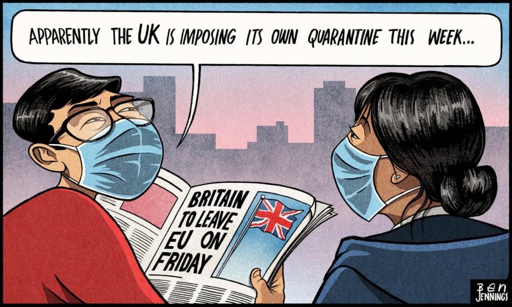 Ben Jennings takes a jibe at Brexit, calling it the UK’s ‘quarantine’ and linking it to the Coronavirus outbreak in China.